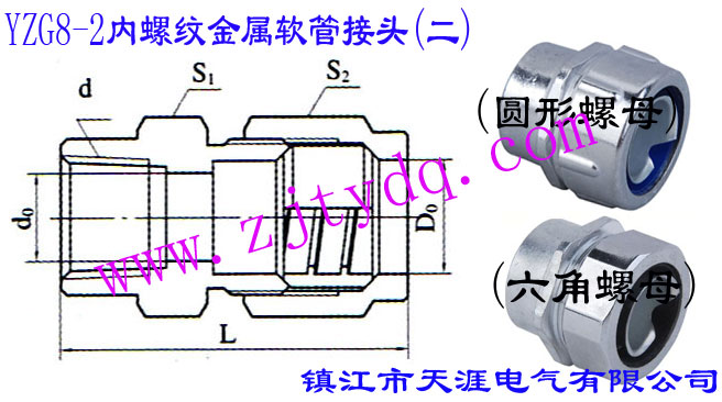 YZG8-2內(nèi)螺紋分別為英制管螺紋ZG1/2"、ZG3/4"、ZG1"和ZG1 1/2"四種螺紋,與其相配的金屬軟管分別為DN13,DN17,DN21和DN31四種。YZG8-2內(nèi)螺紋金屬軟管接頭(二)通常是和保護(hù)管相連接的。